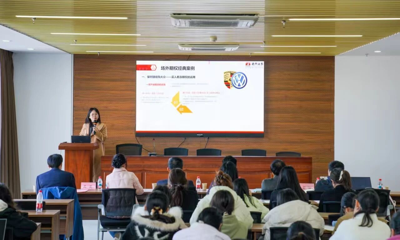 南京证券经纪业务管理总部项目经理胡源老师带来主题为《期权的实操和案例分析》的专题授课。授课内容聚焦场外期权经典案例和场内期权交易实操两个主要方面。胡老师首先介绍了南京证券的基本情况,然后以通俗的例子分析期权的基本概念、特点及交易的方向,以四个经典案例解析场外期权;最后,从四个方面阐述场内期权,巧妙地将知识融入具体的案例,让课堂中晦涩的专业术语生动地展现,帮助同学们更直观地理解金融衍生品工具在风控与交易中的实际应用。