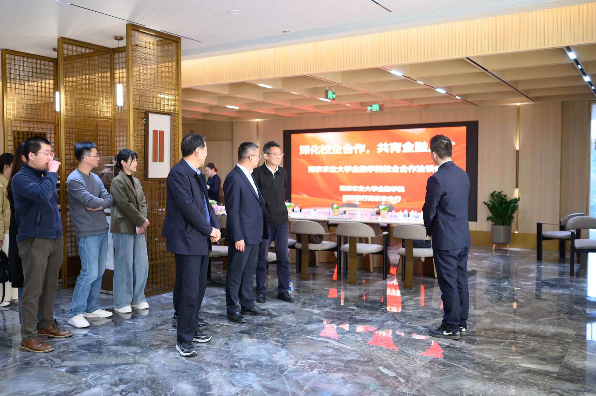 与会人员围绕产教融合、人才共育、双向赋能等方面展开深入交流,就学生实习实践、联合课题研究等方面达成了多项合作共识。交流结束后,在工作人员的带领下,学院师生们走进办公区域及企业文化展示区。通过沉浸式参观与现场讲解,师生对邮储银行的发展理念和行业定位有了清晰认识,对其业务布局与企业文化也有了更深入的了解。